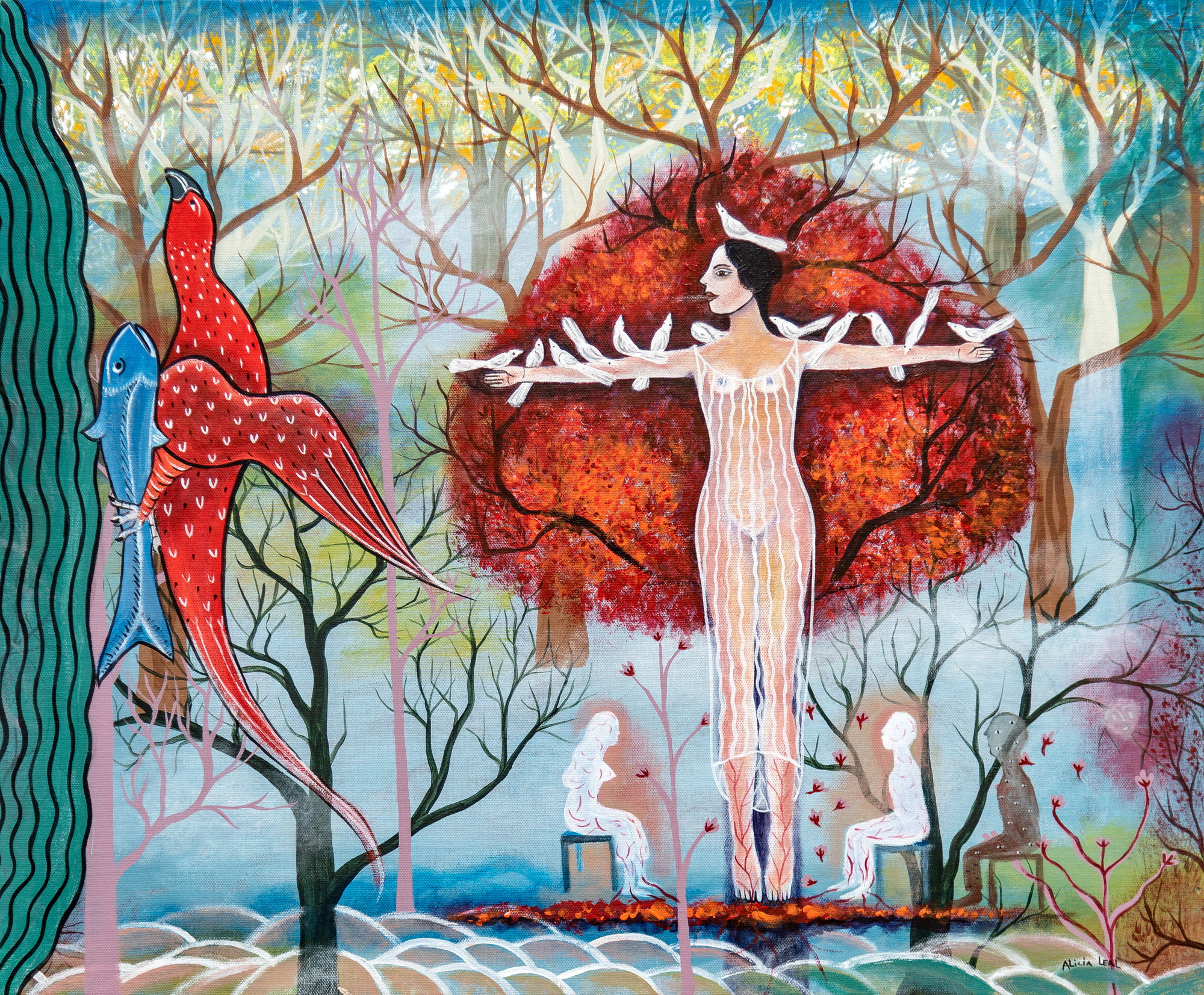 Femininity is symbol and metaphor, narrative pretext that guides the search for arguments to face the reality of our social context. Alicia rescues the scenes of her childhood, the iconography of popular beliefs to make her narrative speech. He appropriates the canons of naive painting through professional training. “Doing the work is nothing more than giving free rein to feelings, ideas, the most secret of oneself from the subconscious to the outside world (…), finding the keys to creation (…) to gradually weave a web that is capable of communicating a state of mind, whether from sexuality, anger, hatred or hopelessness. "