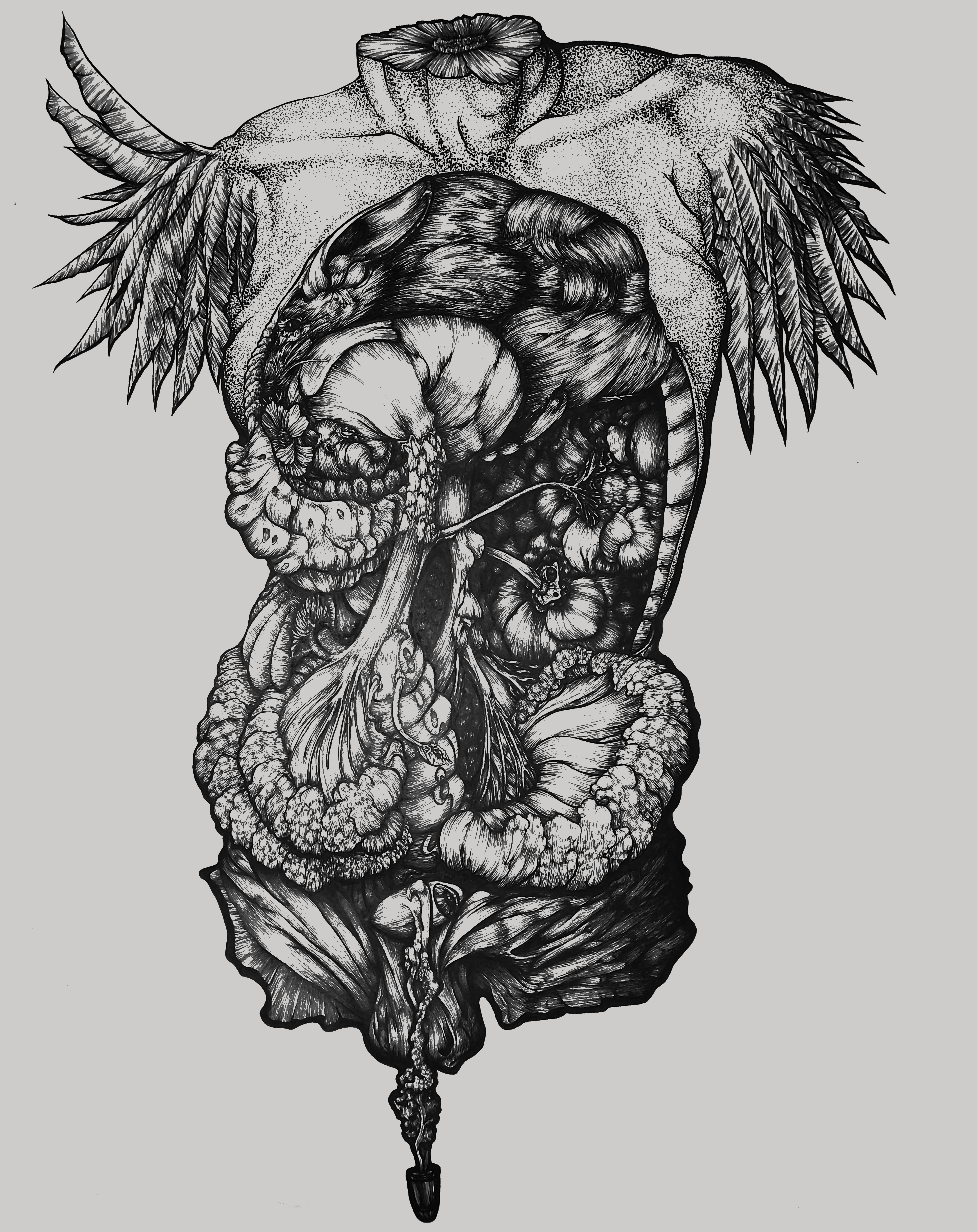 The work Hombre is a cult of the beauty of the human figure inside and out, it illustrates the fauna that lives inside the human being in a symbiotic relationship. Man belongs to the revelations series that revolves around the relationship between man, his exterior and interior universe with equal hierarchy.
