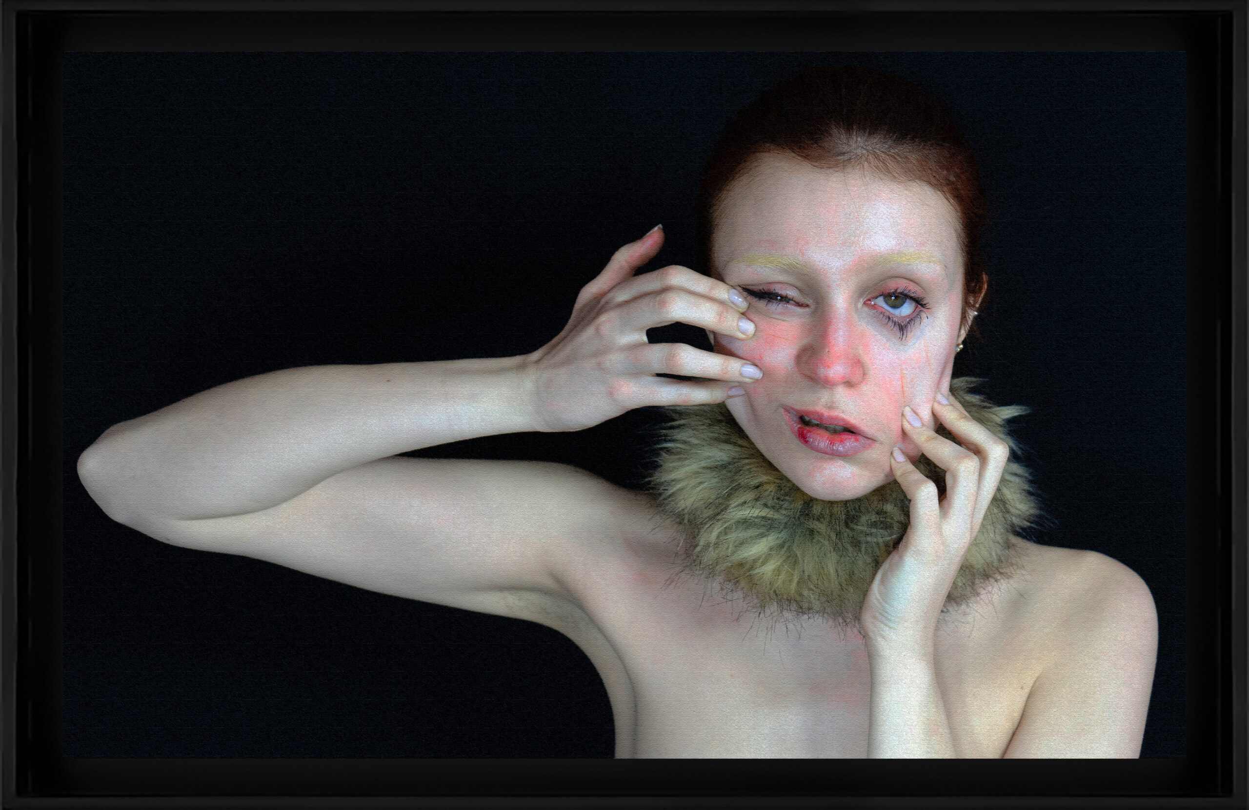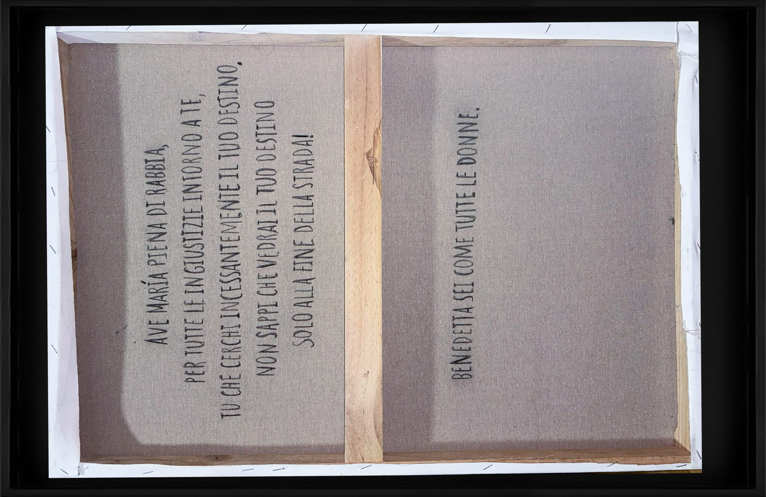 In these works, I raise a discourse that, at its core, is an unceasing dialogue with tortured beauty—a cry for help in the face of the corrosive effects of violence, confronting the being cornered by their own fragility.This piece carries writings authored by me on its reverse side, writings that allude to the sensory impressions of each work. With a poetic style, I use the back of the artworks as a canvas for handwritten words, hidden from plain sight and revealed only to those who dare to uncover them behind each image, each painting, each portrait of pain