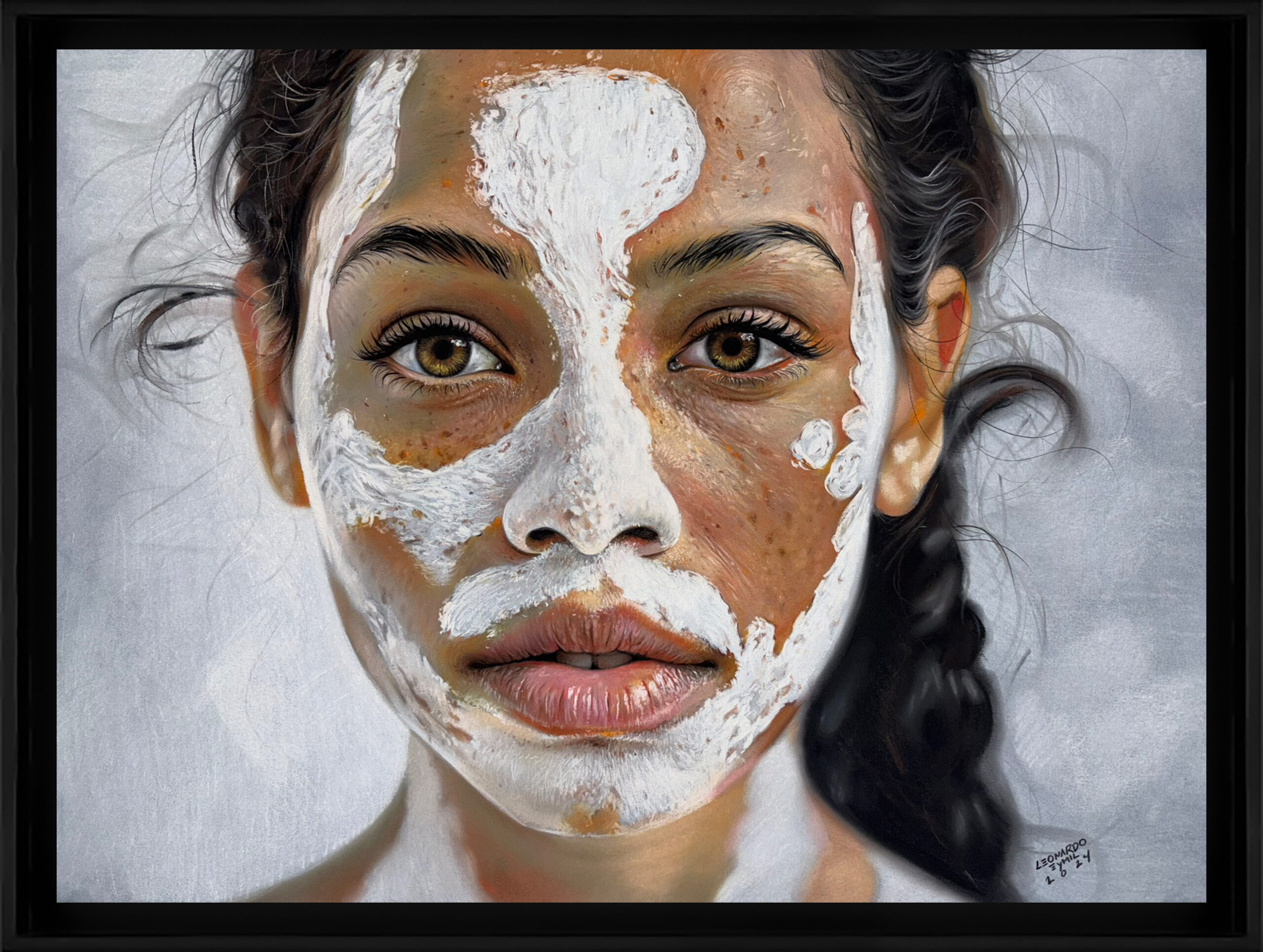 This work is, at its core, an unceasing dialogue with tortured beauty—a cry for help against the corrosive effect of violence, confronting the being cornered by its own fragility.This piece carries writings authored by me on its reverse side, writings that allude to the sensory impressions of each work. With a poetic style, I use the back of the artworks as a canvas for handwritten words, hidden from plain sight and revealed only to those who dare to uncover them behind each image, each painting, each portrait of pain.