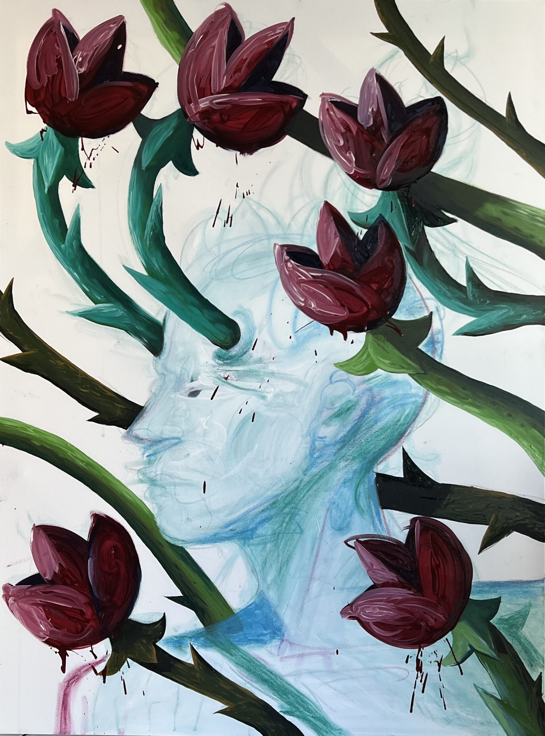 Ghost is a haunting presence, trapped between the visible and the intangible. The man, portrayed as a ghost, seems to fade among the vibrant flowers surrounding him, as if life itself is claiming him while he resists belonging. The flowers, with their intense colors, do not celebrate; they invade, burdened with a beauty so overwhelming it almost hurts. What remains of oneself when life overwhelms? What does it mean to be a ghost among things that are too alive?