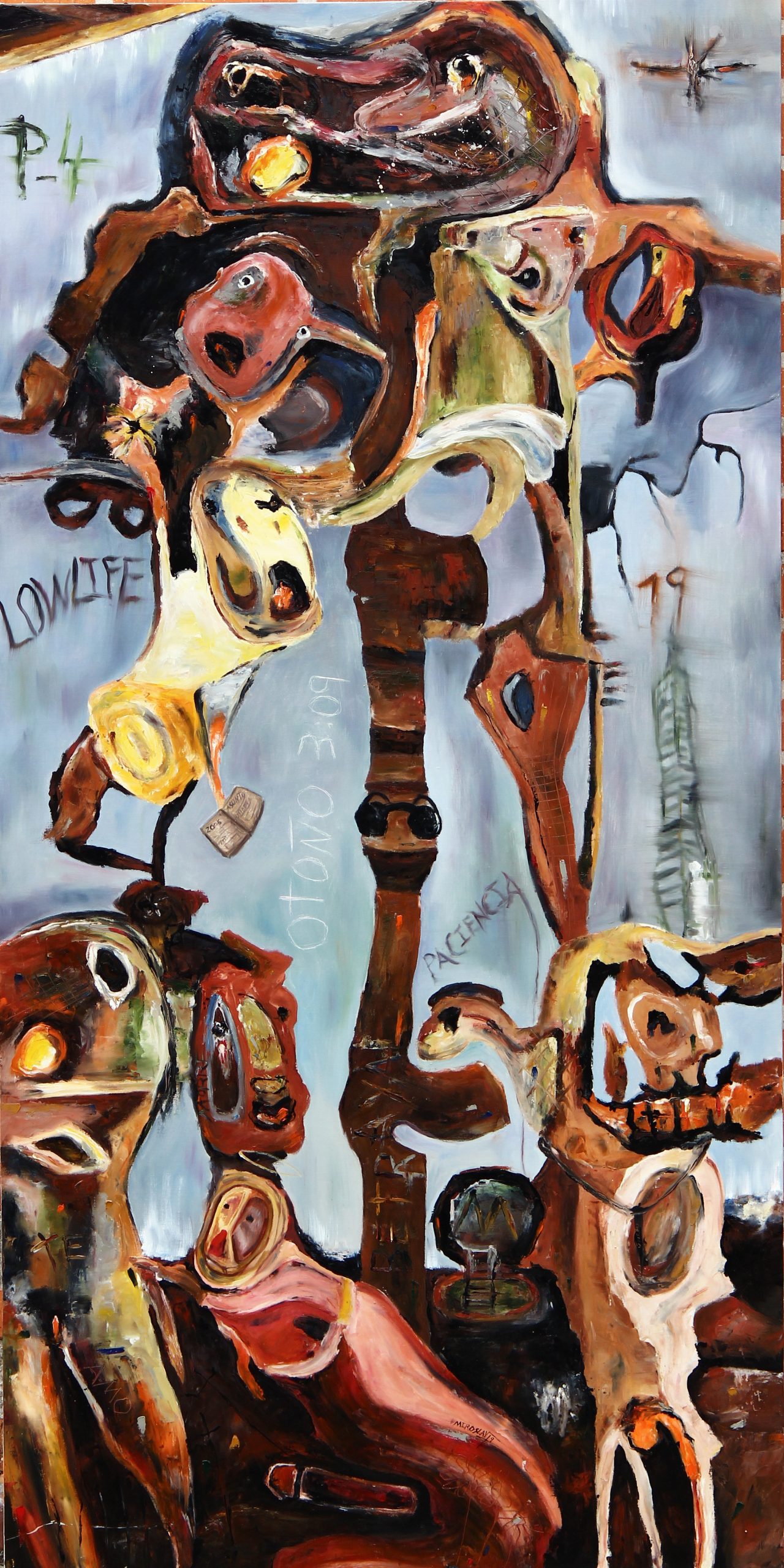 On the two-dimensional level, the work starts from a first expressionist moment, to evolve towards a gestural and casual informalism. It uses the physical distortion and disproportion of the figures as an expressive resource, which accentuate the violence and dehumanization of the images, to move between abstraction and figuration.