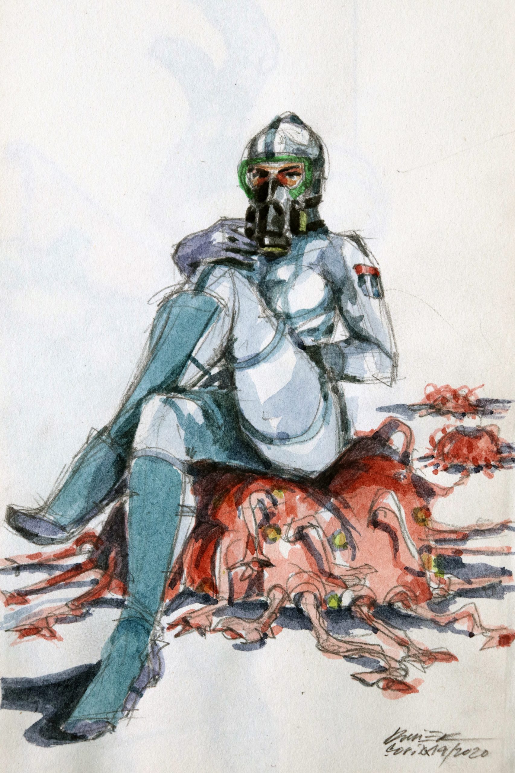 Diese Zeichnungsserie entstand aus der Notwendigkeit, mit der durch die Covid-19-Krankheit verursachten weltweiten Gesundheitskrise zu leben. Nach den ersten zwei Wochen in Quarantäne und ohne Zugang zur Werkstatt, Ein Block, den ich zu Hause hatte, diente als Unterlage für diese Art von Logbuch. Eine tägliche Zeichnung, die immer in meinen sozialen Netzwerken veröffentlicht wurde, war Ausdruck eigener Anliegen, aber auch kollektiv.