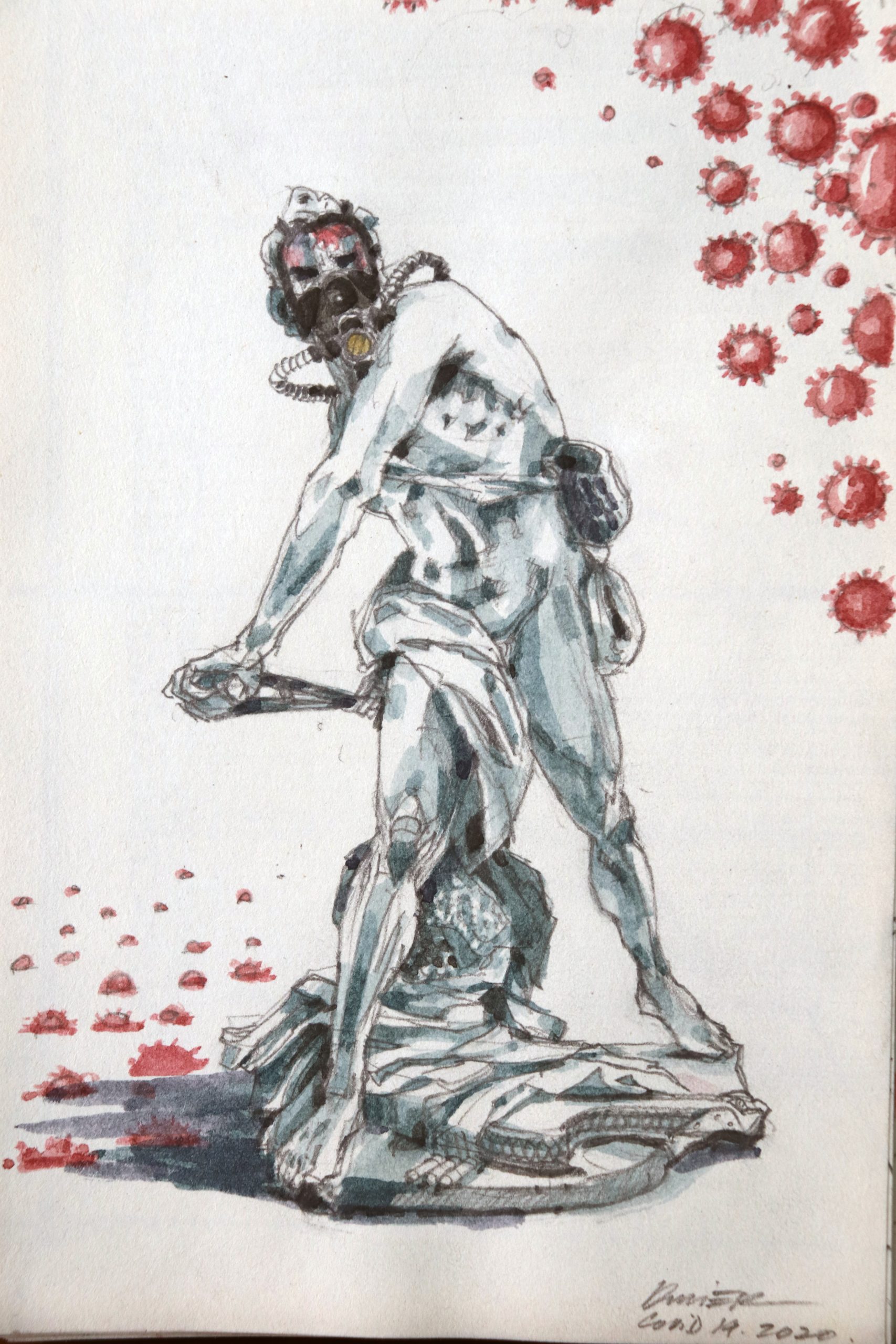Diese Zeichnungsserie entstand aus der Notwendigkeit, mit der durch die Covid-19-Krankheit verursachten weltweiten Gesundheitskrise zu leben. Nach den ersten zwei Wochen in Quarantäne und ohne Zugang zur Werkstatt, Ein Block, den ich zu Hause hatte, diente als Unterlage für diese Art von Logbuch. Eine tägliche Zeichnung, die immer in meinen sozialen Netzwerken veröffentlicht wurde, war Ausdruck eigener Anliegen, aber auch kollektiv.