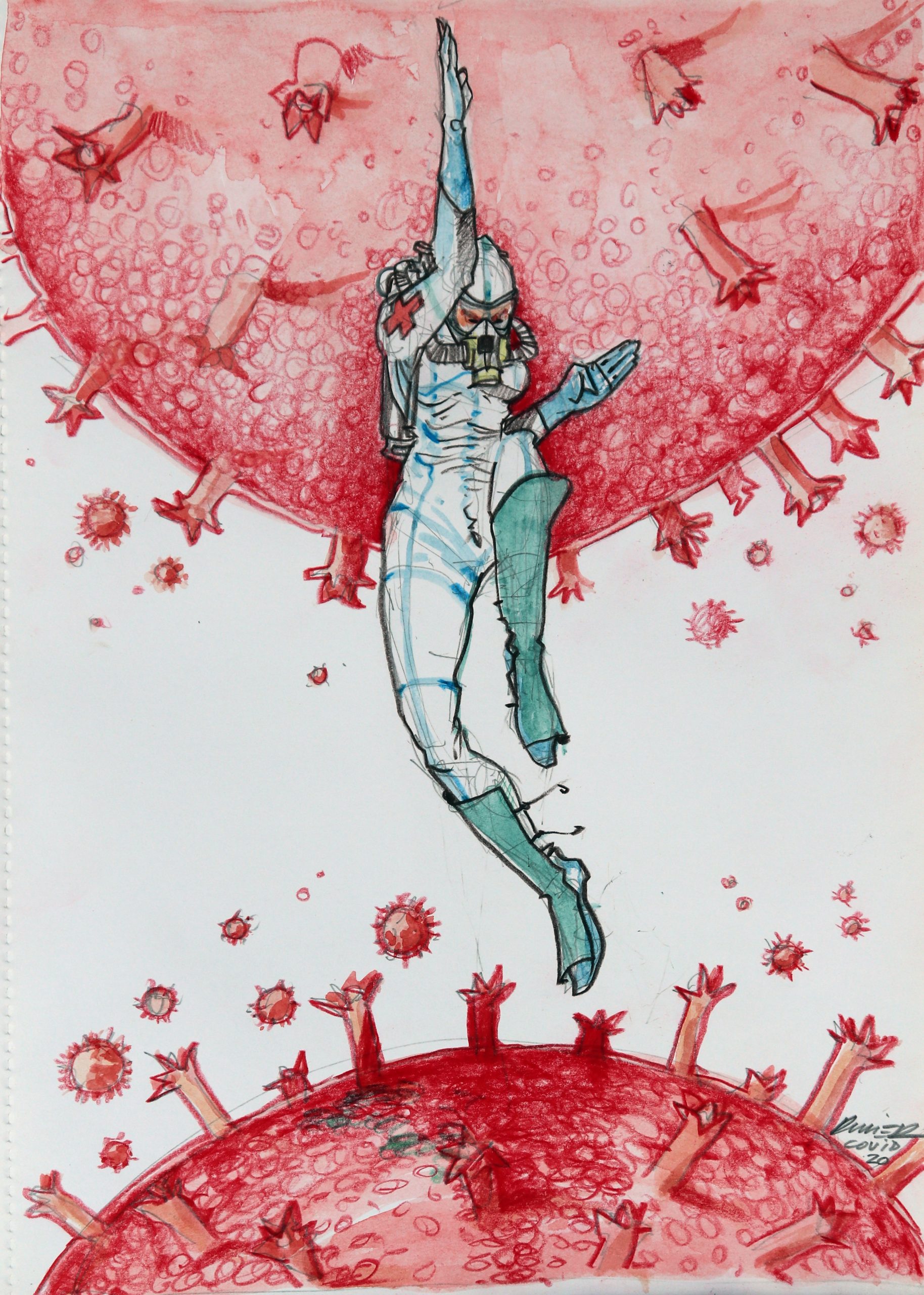 Diese Zeichnungsserie entstand aus der Notwendigkeit, mit der durch die Covid-19-Krankheit verursachten weltweiten Gesundheitskrise zu leben. Nach den ersten zwei Wochen in Quarantäne und ohne Zugang zur Werkstatt, Ein Block, den ich zu Hause hatte, diente als Unterlage für diese Art von Logbuch. Eine tägliche Zeichnung, die immer in meinen sozialen Netzwerken veröffentlicht wurde, war Ausdruck eigener Anliegen, aber auch kollektiv.