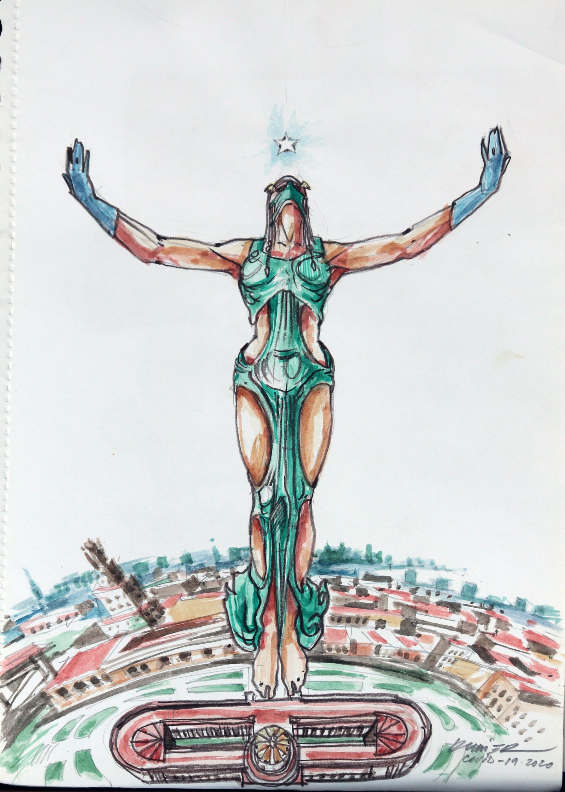 Diese Zeichnungsserie entstand aus der Notwendigkeit, mit der durch die Covid-19-Krankheit verursachten weltweiten Gesundheitskrise zu leben. Nach den ersten zwei Wochen in Quarantäne und ohne Zugang zur Werkstatt, Ein Block, den ich zu Hause hatte, diente als Unterlage für diese Art von Logbuch. Eine tägliche Zeichnung, die immer in meinen sozialen Netzwerken veröffentlicht wurde, war Ausdruck eigener Anliegen, aber auch kollektiv.