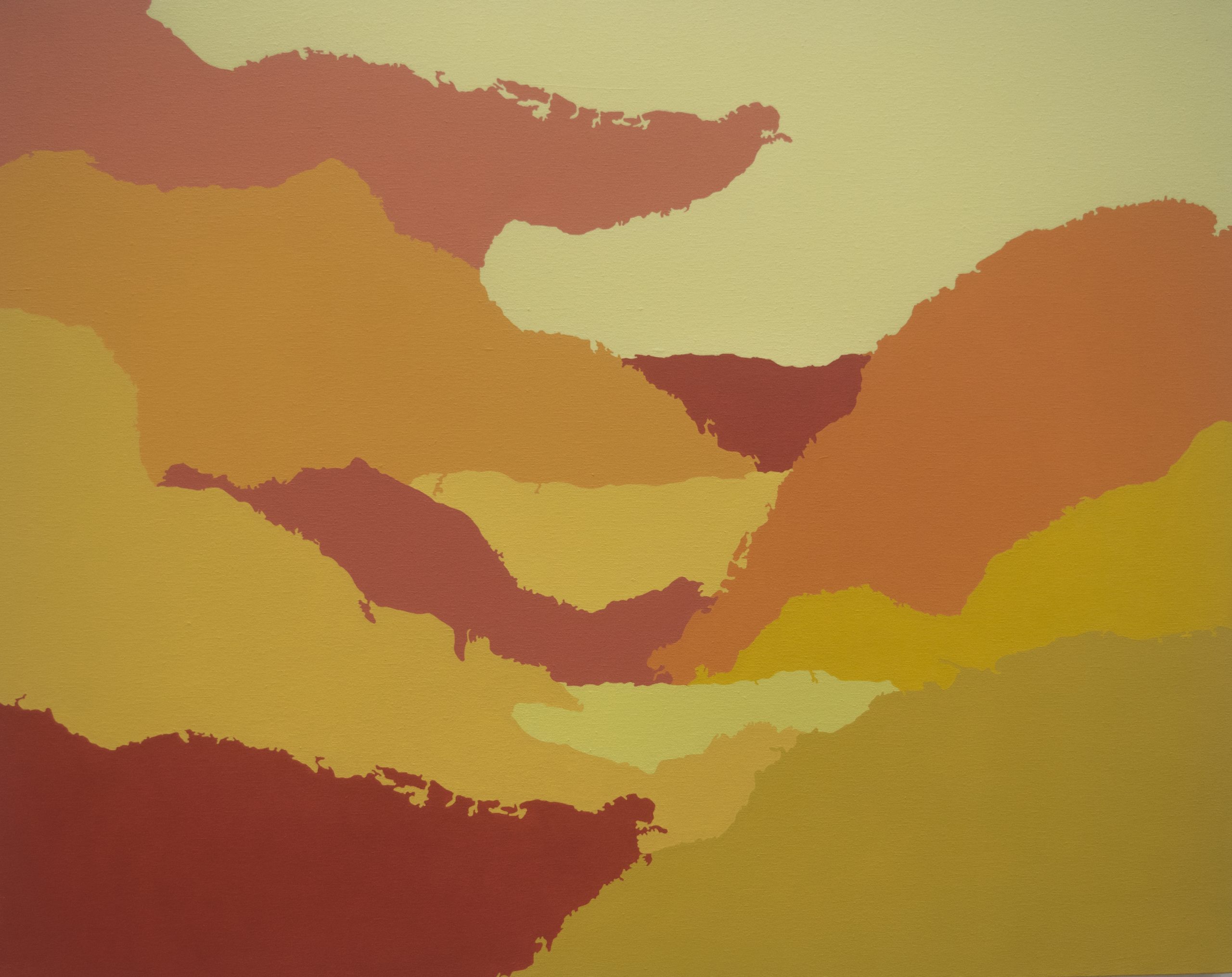 Hypothetically making a bojeo, marking a contour line of a certain section, I divide, move and rearrange the map of the Island of Cuba using it as a template. The crossing of a line with others creates areas in space which are delimited by color planes. Each abstract landscape responds to a stereotype of ‟the Cuban”. The main intention is to question if only what is exported is what we are.