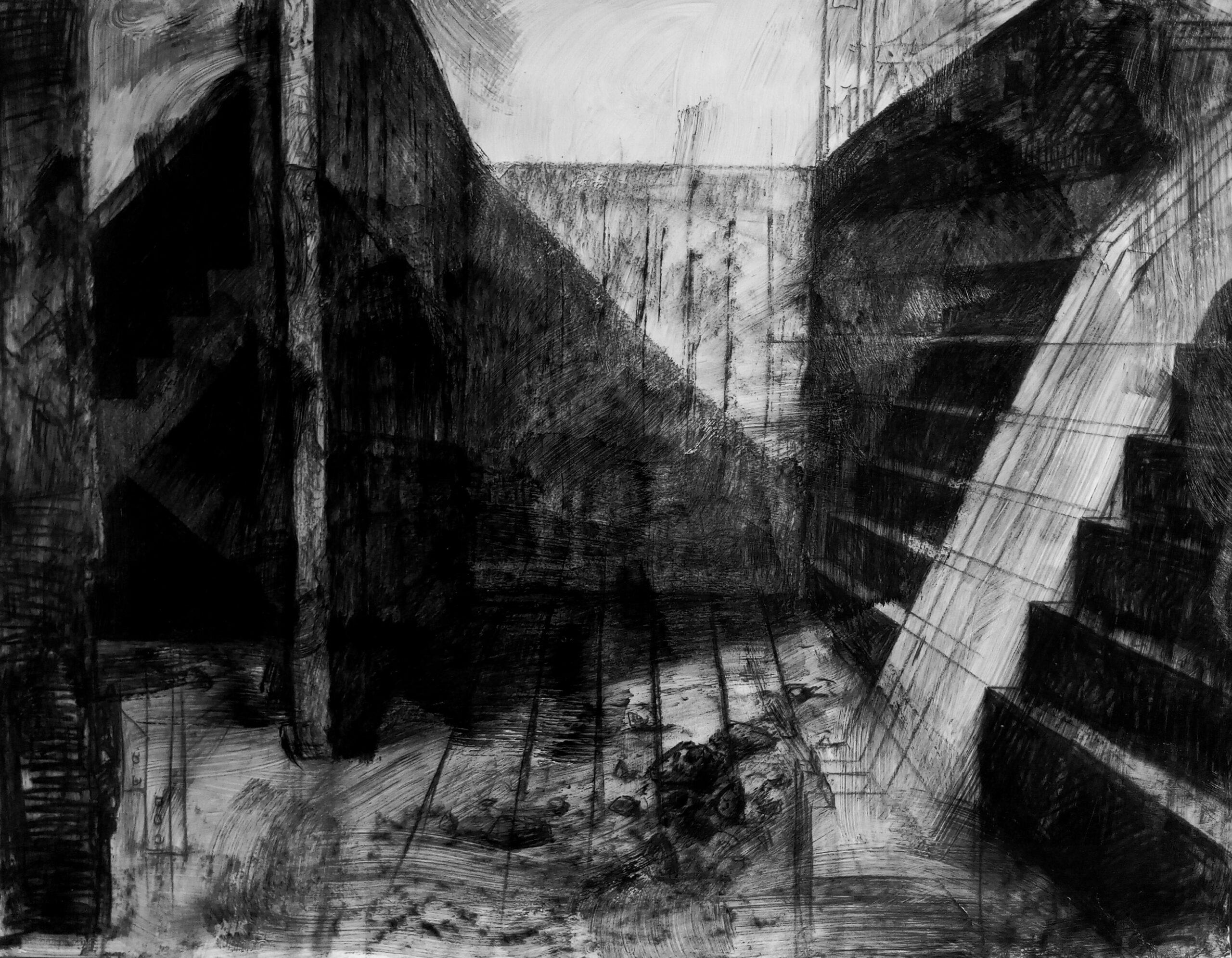 Diese Zeichnungen sind eine Neuinterpretation ungenutzter Räume, in Trümmern, zu dem ich mich einige Zeit auf der Suche nach einer spirituellen Motivation begab.