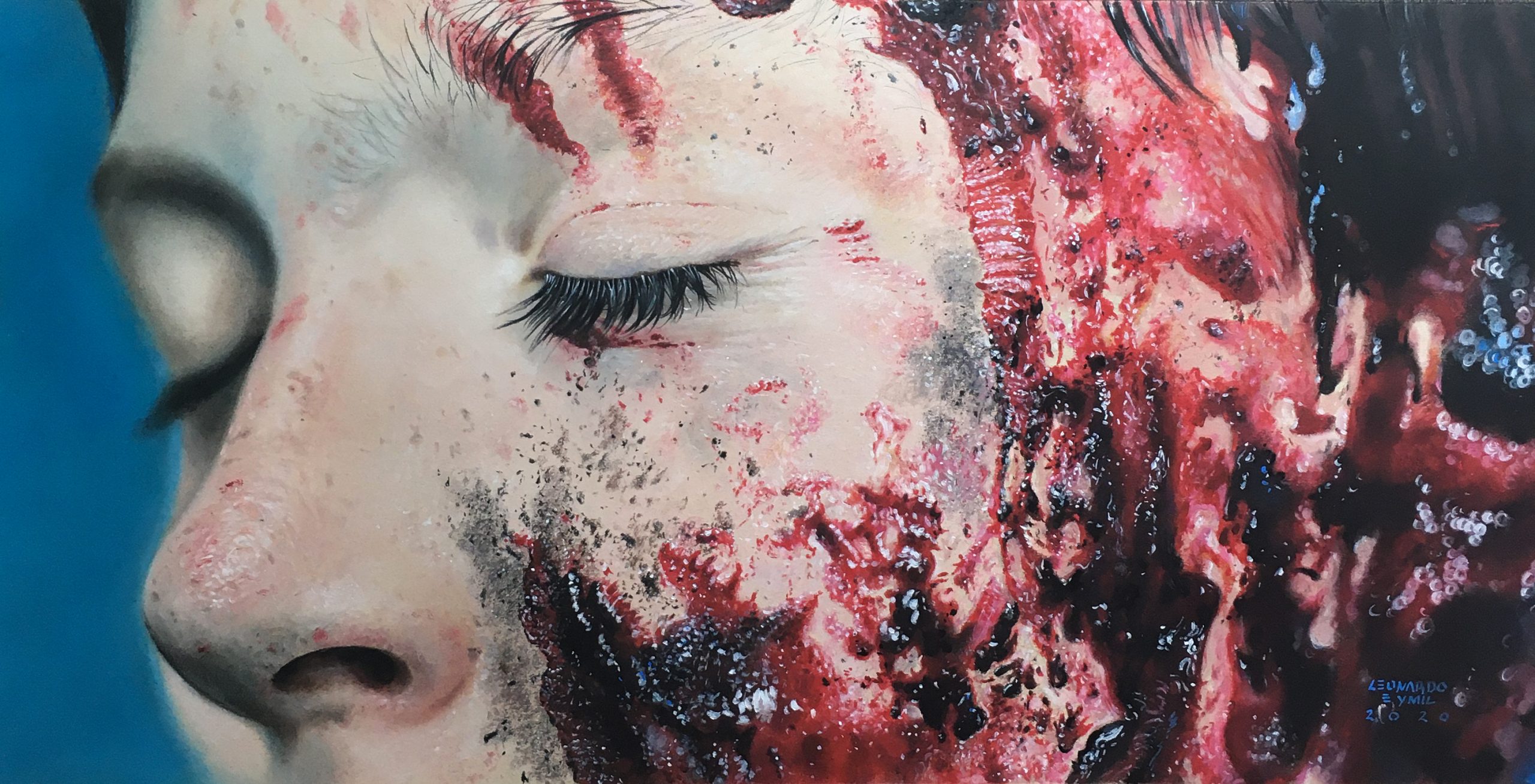"Unschuld verloren" ist ein Stück, das ein Kind darstellt, sterben, ein in Blut gehülltes Kind, zeigt das Fragment der geschlossenen Augen, als ob er es wäre, nachdenklich oder tot, auf realistische und herzzerreißende Weise.