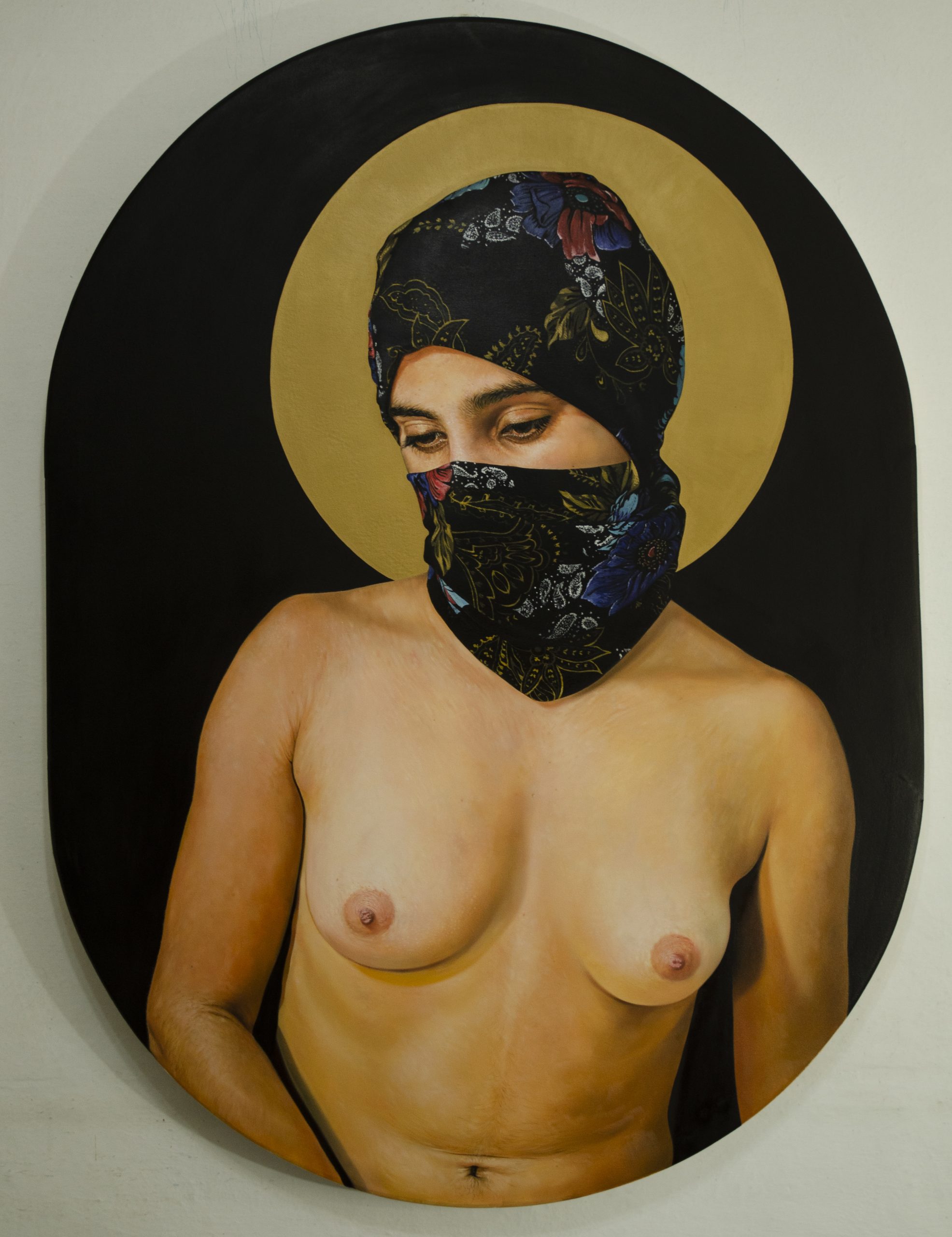 Eine nackte Büstenfrau mit Niqab (Muslimischer Schleier) ist eines der wichtigsten Merkmale dieser Arbeit. So brechen Sie sehr starke und bedrückende religiöse Dogmen.