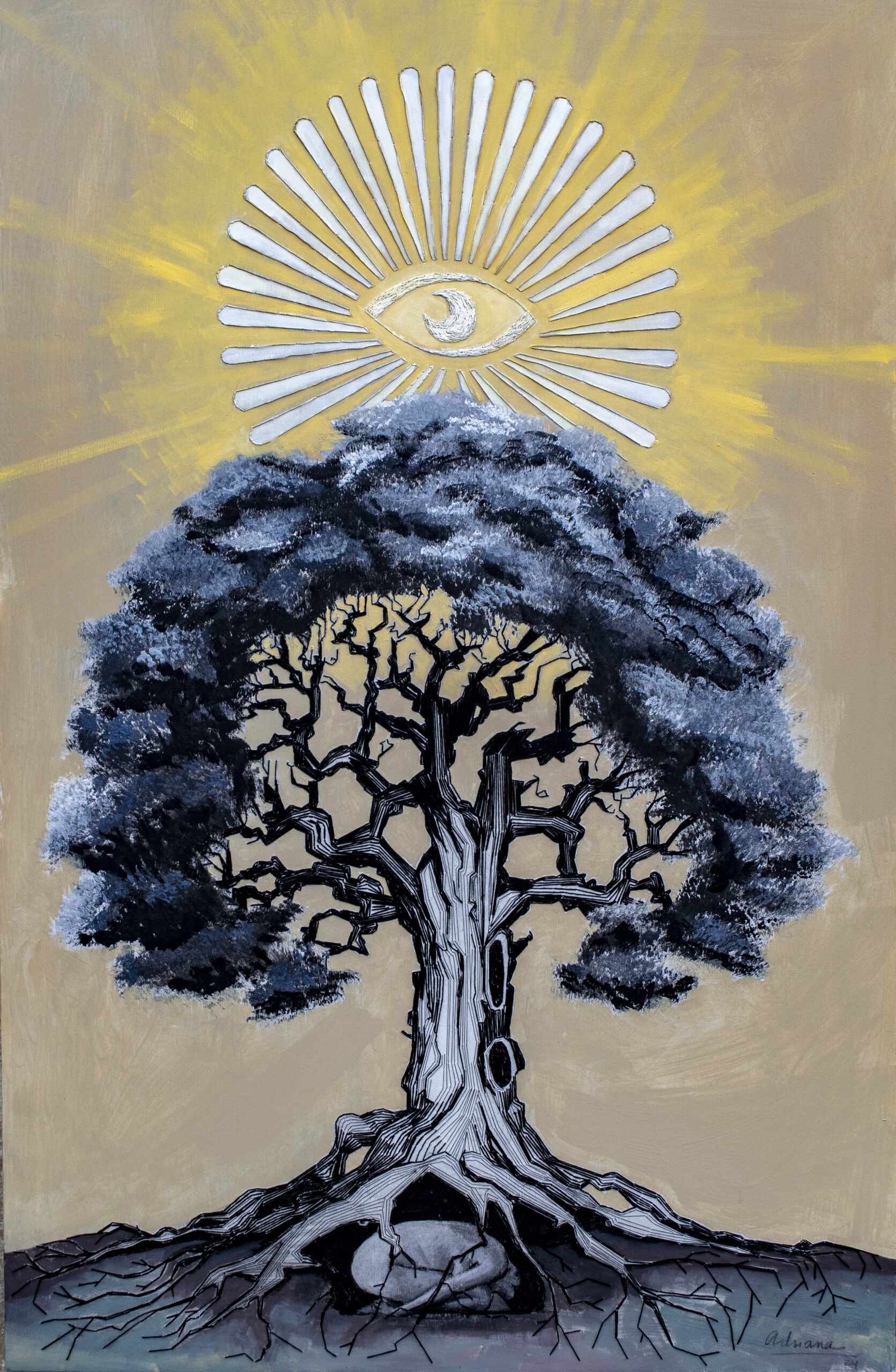La inclusión de un cuerpo humano en forma de una semilla simboliza la conexión entre el yo y la naturaleza. El uso de hilo bordado agrega una dimensión de textura que invita a la contemplación, transformando la superficie del lienzo en algo más táctil. El formato vertical sugiere crecimiento y aspiración, contrastar con las representaciones más horizontales del paisaje que a menudo enfatizan la inmensidad del medio ambiente. El trabajo nos invita a reflexionar sobre nuestro papel en el ciclo de la vida y nuestro impacto en el mundo, cambiando de la representación objetiva del paisaje a una narrativa personal y colectiva.