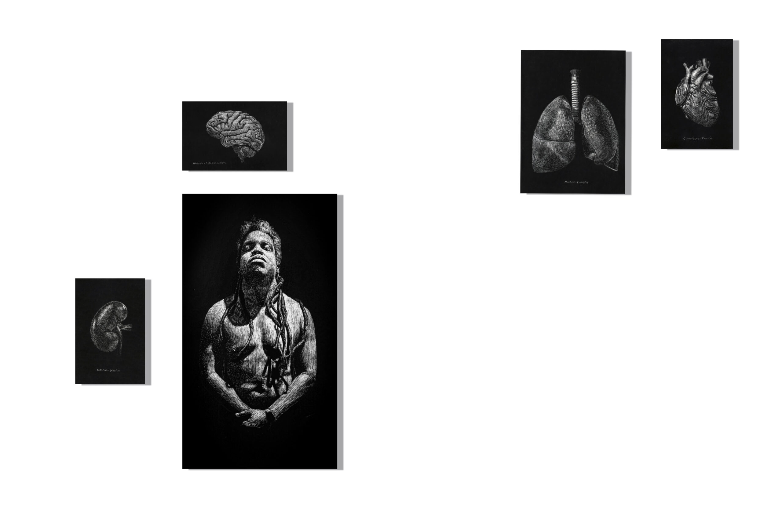 La obra consta de un conjunto de scratchboards que representan mi cuerpo y órganos vitales., cada uno con el nombre de una ciudad y país donde residen personas muy importantes en mi vida que hoy se encuentran fuera de Cuba. Me interesa expresar el dolor y la fragmentación que sentimos al perder una parte de nosotros mismos con cada persona que sale de nuestra realidad., nuestro contexto, nuestra vida.
