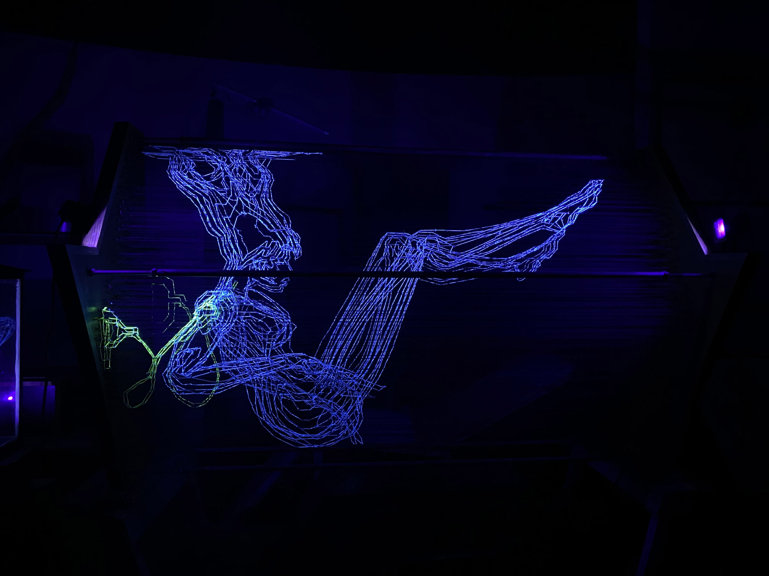 Acero, cebolla de madera, columnas telescópicas, seda artificial, poliéster negro y luz ultravioleta.
