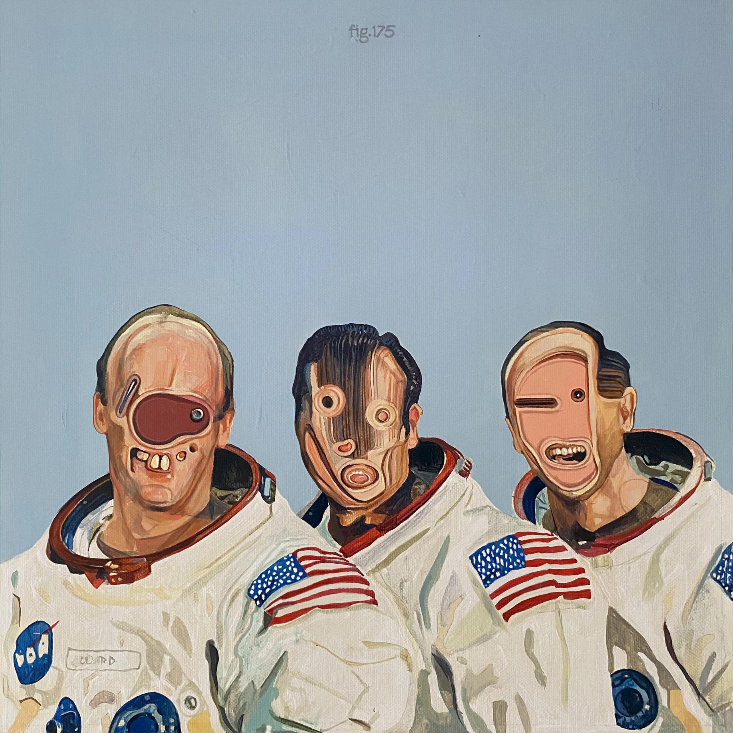 Se trata de una serie de pinturas y dibujos centrados en el retrato histórico espacial., donde abordo el tema ideológico, específicamente la competencia espacial desarrollada entre Estados Unidos y la ex Unión Soviética, en medio de la guerra fría. Son imágenes de cosmonautas y astronautas cuya anatomía facial distorsioné y transformé en monstruos.. Los retratos de estos pioneros espaciales representaron ante el mundo los ideales de su nación.. Estos personajes fueron noticia en los medios y llamaron mucho la atención de quienes seguían toda esta maquinaria propagandística., que no hizo más que dividir al mundo en facciones y crear tensiones. Millones de personas permanecían expectantes, casi nadie fue ajeno a este fenómeno espacial. Las dos superpotencias rivalizaban en áreas de ciencia y tecnología., pero sin perder nunca de vista el componente ideológico-propagandístico.