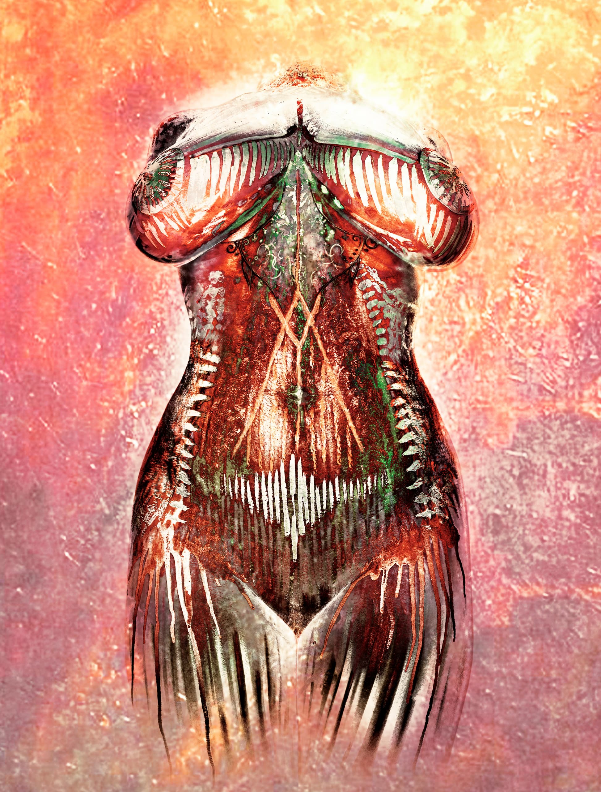 " Erotismo Regente " es una obra que fusiona la técnica del bodypaint con la fotografía, Creando un diálogo visual entre el cuerpo humano y el arte.. Esta pieza resalta el color rojo., símbolo de pasión y vitalidad, que se entrelaza con pinceladas afiladas que evocan una sensación de poder y energía. La imagen resultante no sólo capta la esencia del erotismo, pero también celebra la vida en su forma más pura y visceral.. Cada trazo y sombra cuenta una historia de fuerza y sensualidad., invitándote a explorar la conexión entre el cuerpo y el arte. "Erotismo Regente" es una declaración de la belleza y el poder que reside en la expresión humana., un recordatorio de que el arte puede ser un vehículo para la exploración de nuestras emociones más profundas. Esta obra es un homenaje a la vida., al deseo y a la fuerza que emana de la vulnerabilidad, invitando a todos a reflexionar sobre la complejidad de la experiencia humana.